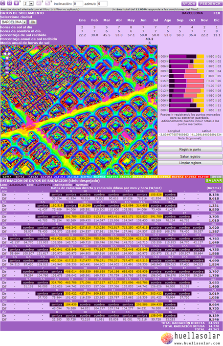 Ahora el visor web huellasolar incluye una estimación de los datos de radiación solar y ofrece información sobra las horas en las que un punto recibe sombras proyectadas.